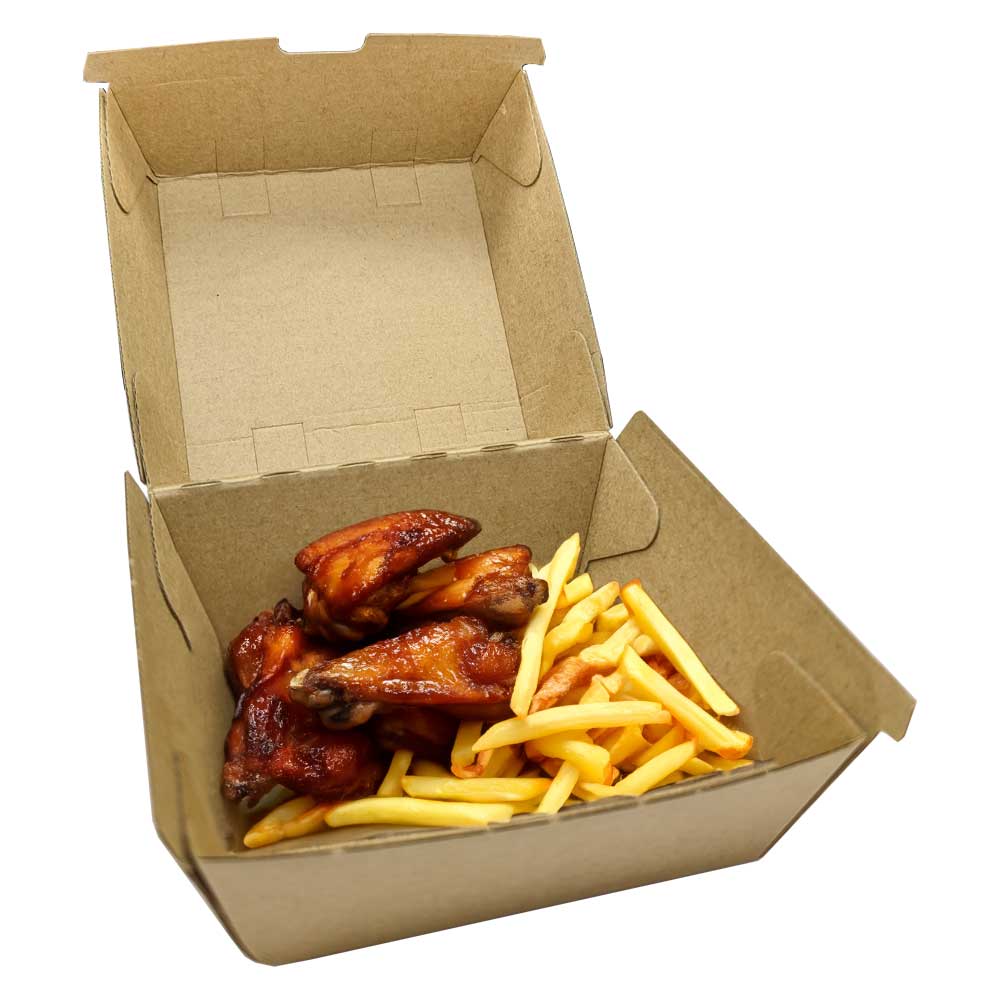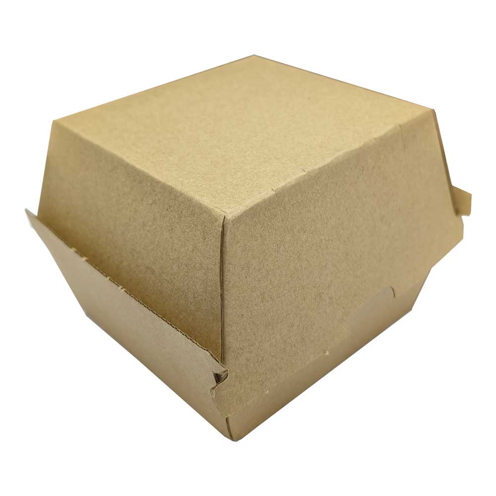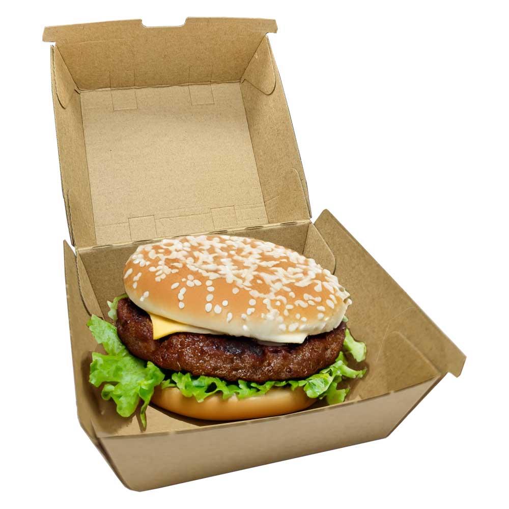 Die Hamburgerboxen (105x102x84 mm) bestehen aus stabiler, brauner Wellpappe. Sie eignen sich nicht nur für Hamburger, sondern auch ideal für Pommes, Nuggets oder anderes Fingerfood. Durch die kompakten Abmessungen liegt die Burgerbox gut in der Hand. Die robuste Wellpappe schützt diese Verpackungsbox eine gewisse Zeit vor einem durchweichen bei fettigen Speisen und eine PE-Beschichtung ist somit nicht nötig. Diese Verpackungsschachtel für Burger, Nuggets, Wings, Pommes oder ähnlichen Speisen kommt also ganz ohne Kunststoff aus.