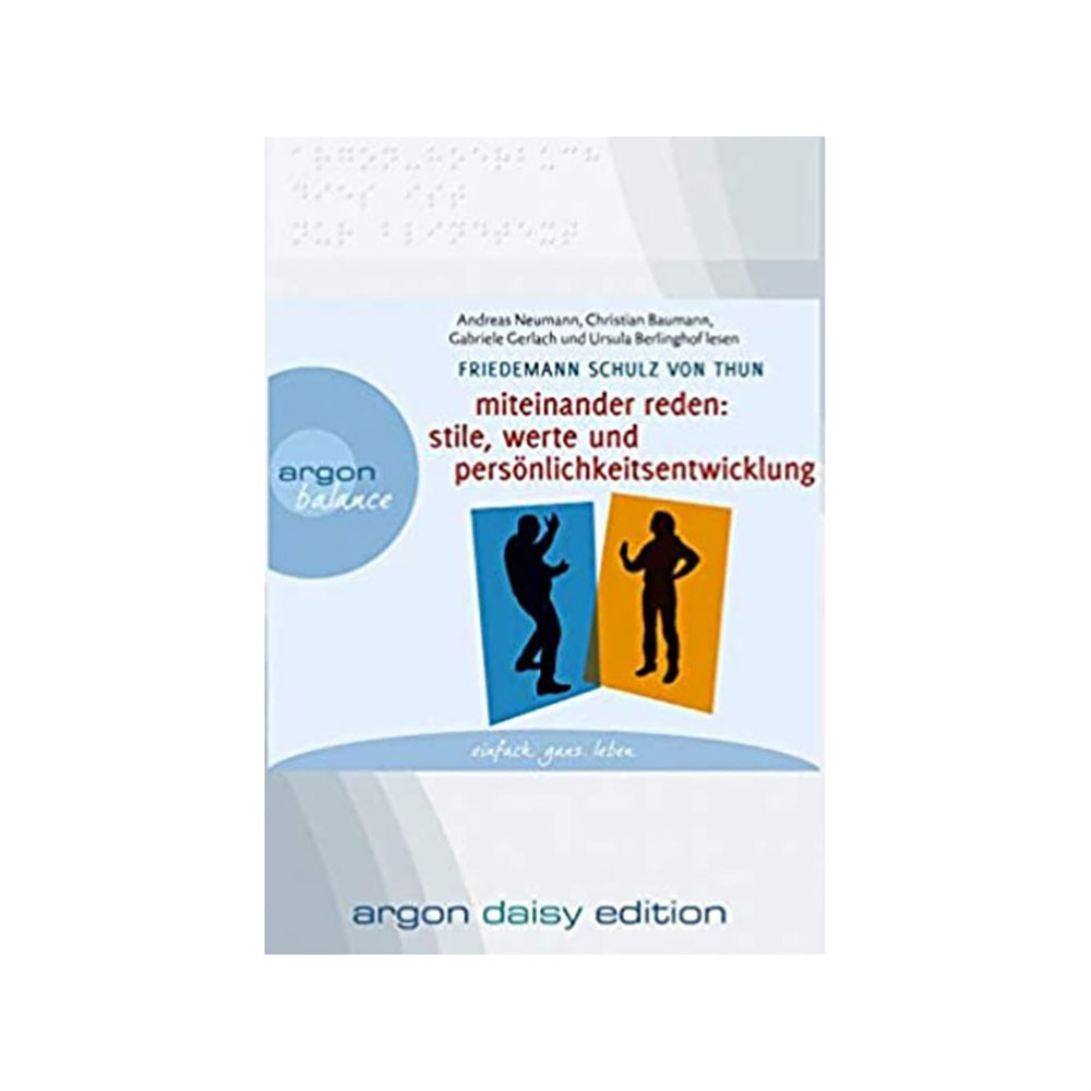 "Miteinander reden Teil 2" ist ein Hörbuch, das uns dabei unterstützt, uns und unsere Umwelt besser zu verstehen und unsere Kommunikation zu verbessern. Friedemann Schulz von Thun, einer der führenden Kommunikationspsychologen, zeigt uns, wie wir auf persönlicher und sachlicher Ebene besser kommunizieren können. In diesem zweiten Teil geht es um die verschiedenen Kommunikationsstile und wie wir am besten mit ihnen umgehen können. Außerdem erfahren wir, wie wir das Wissen um unseren eigenen Kommunikationsstil für unsere Persönlichkeitsentwicklung nutzen können. Das Hörbuch wird in einer Amaray/DVD-Box mit Punktschriftaufkleber für blinde und sehbehinderte Hörer verpackt und ist inhaltsgleich auch als Audio-CD erhältlich. Besonders für Menschen mit Sehbehinderung oder Lernschwierigkeiten ist die DAISY-Funktionalität des Hörbuchs von großem Nutzen. DAISY steht für Digital Accessible Information System und ermöglicht es, dass der Hörer von Kapitel zu Kapitel oder von Satz zu Satz springen, die Sprechgeschwindigkeit regulieren und Lesezeichen setzen kann. Auf der CD sind die Softwareprogramme DAISY-Leser und Max DaisyPlayer als Freeware enthalten, die es dem Hörer ermöglichen, das Hörbuch auf einem speziellen Abspielgerät oder auf dem Computer zu nutzen. Die meisten MP3-Player spielen DAISY-Hörbücher ebenfalls ab, allerdings ohne DAISY-Funktionalität. Mit diesem Hörbuch und den nützlichen Funktionen der DAISY-Technologie steht einer erfolgreichen und angenehmen Kommunikation nichts mehr im Wege. Tonträger, DVDs, und Software können wir nur originalversiegelt zurücknehmen - außer bei technischem Defekt.