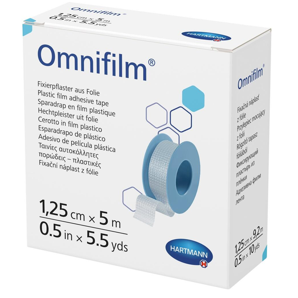 OMNIFILM Fixierpflaster Folie, 1,25 cm x 5 m, PZN: 11163248. Zur schonenden Fixierung von Wundauflagen, Kanülen, Kathetern, bei empfindlicher Haut. Transparente Polyethylen-Vinylacetatfolie, hypoallergener Acrylkleber. Hergestellt von Paul Hartmann AG.